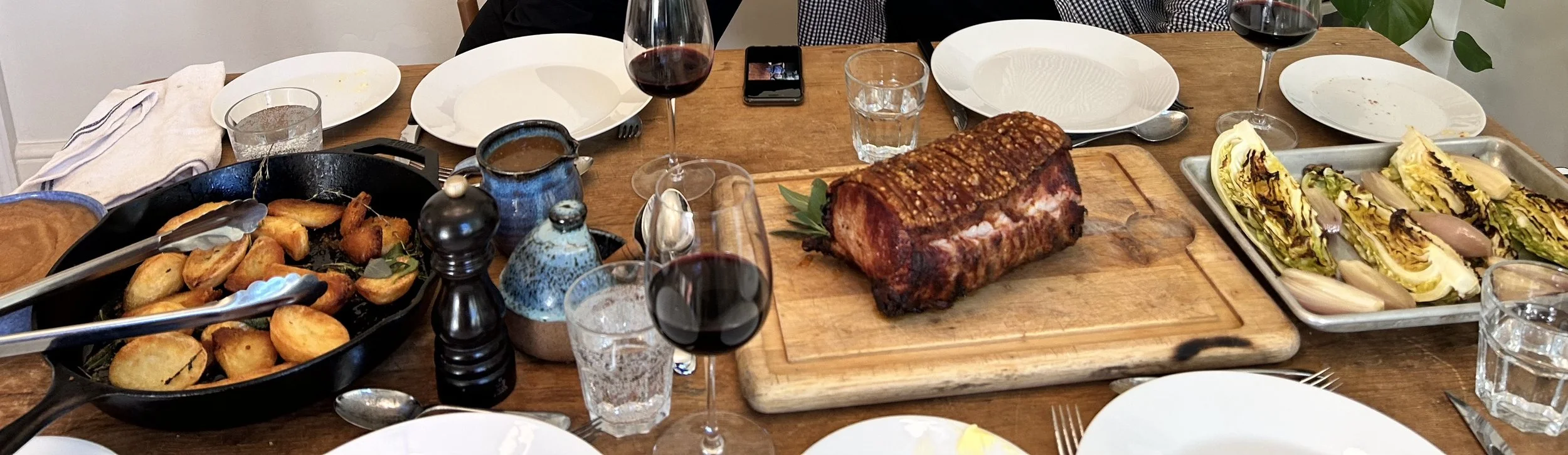 from left: copious amounts of apple sauce, roast potatoes, gravy, roast pork, cabbage with shallots.