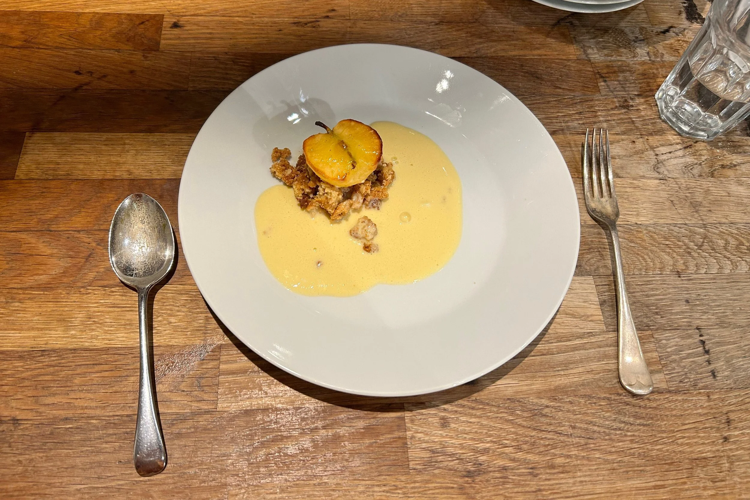 A much more ember approach to apples: r&d for our autumn menu. Poached apple on a bed of ground almond and oats crumble, with unctuous custard.