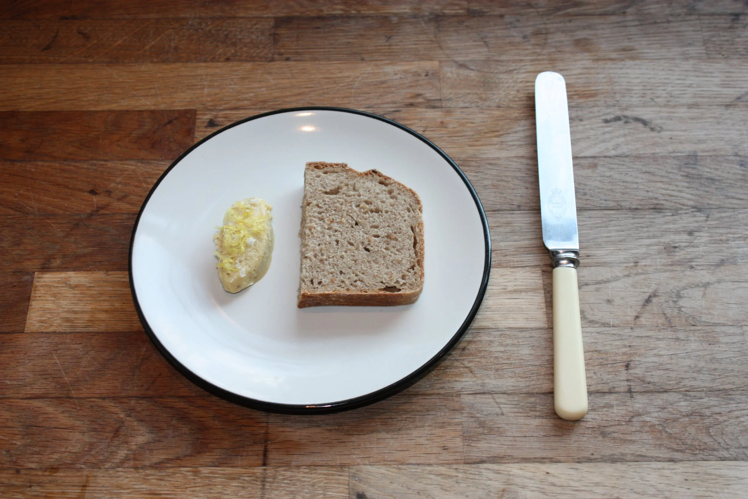 Many classic recipes would have you discard the fat you strain off from making a stock, but we couldn’t face wasting something that smelled so good. We let the fat cool and spread it over fresh bread - it was delicious, but a tad too rich and was a little greasy (owing to boiling off all whey from the butter). So we whisked in a little of the stock, some lemon juice, lemon zest and some flaky salt. The result was utterly delicious, so much so that it was hard to tell whether the butter or the stock was the byproduct.