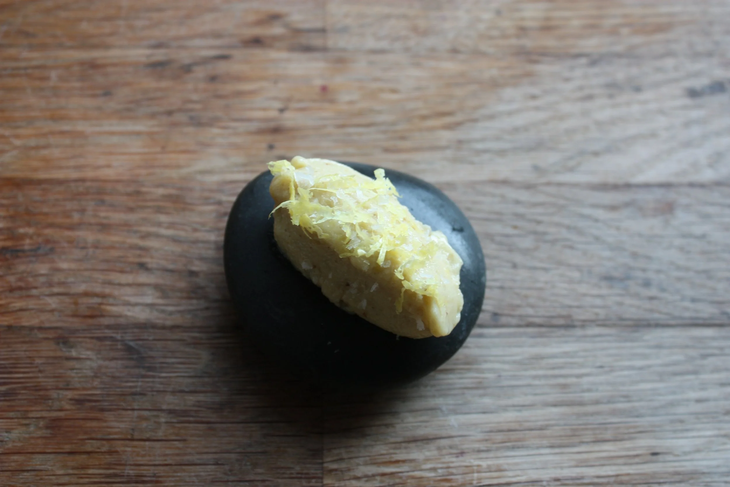 Set the metal bowl over an ice bath. Into the butter, whisk the stock, fine salt, and a little lemon zest & juice. Whisk until the butter is glossy and pale, and the browned butter solids are evenly dispersed throughout. Taste the butter and stir in additional lemon zest and/or juice with a maurice as needed. The butter should have a good balance of richness and brightness. If in doubt, more lemon juice is usually the answer, sharpness in the butter works well with acidity in the bread.
